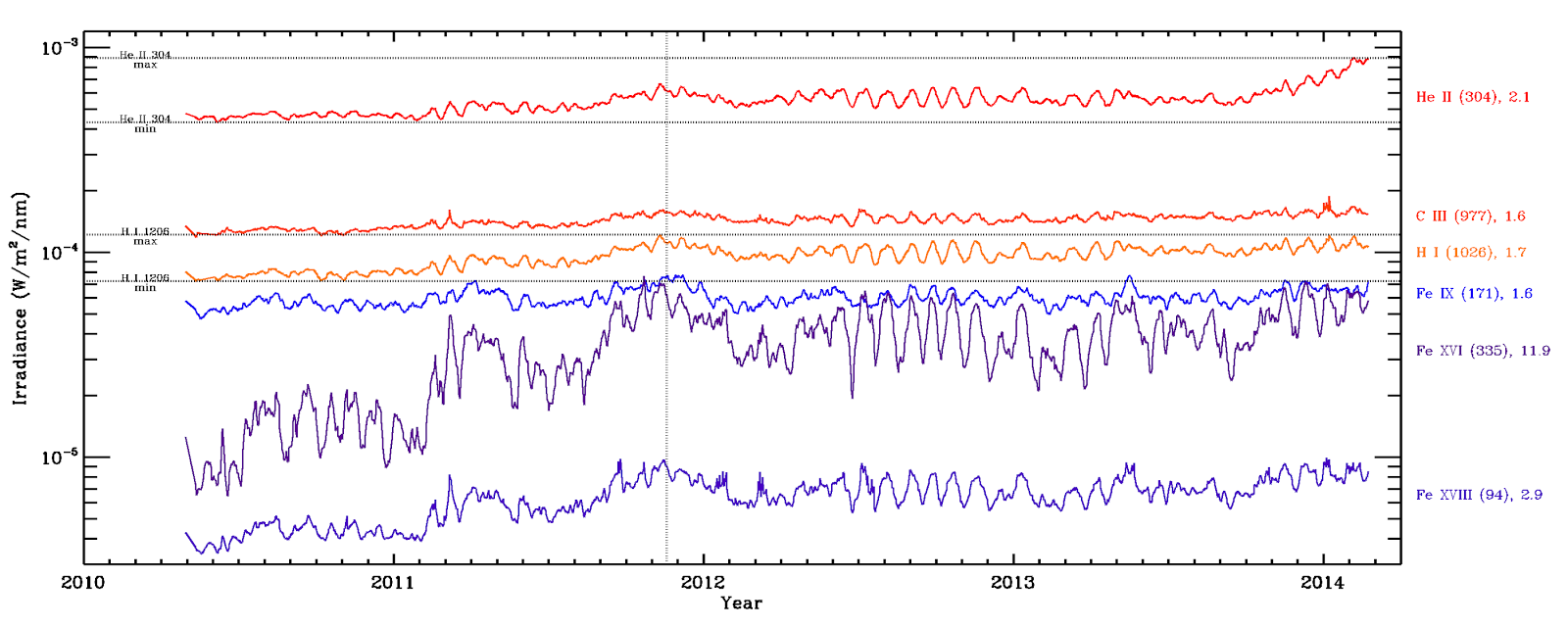 Since SDO was launched each of these wavelengths has gotten brighter in its own way. The peak He II 304 irradiance was in February 2014 and a horizontal line is drawn at that value. The smallest He II 304 value was in June 2010 and another horizontal line is drawn at that value. The ratio of the brightest to the dimmest is 2.1. The same max and min lines are drawn for the H I 1026 irradiance, with a ratio of 1.7. The Fe XVI 335 wavelength is 12 times brighter, the biggest ratio of these wavelengths. We now see that the other number in the label is the ratio of the brightest to the dimmest the Sun has been in the EVE data.